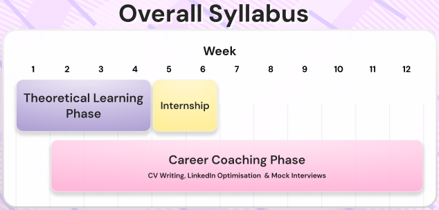 This isn’t just another bootcamp, it’s a direct path to secure your role as a Project Manager, Agile Delivery Manager or Scrum Master. In the first four weeks, you’ll master both Waterfall and Agile methodologies, reinforced with weekly workshops to lock in your skills and apply them with confidence. Next, you’ll complete an internship that turns your own experience into proof you can deliver results that you can add to your CV. And from week two through week eleven, you’ll get tailored coaching on your CV, LinkedIn, and interviews, giving you the edge to land the role.
